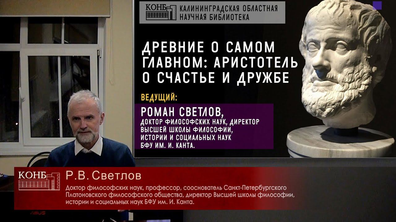 Ведущий: Роман Викторович Светлов, доктор философских наук, директор Высшей школы философии, истории и социальных наук БФУ им. И. Канта. В наше время такие понятия, как «счастье» или «дружба» кажутся чем-то далеким от «коренных философских интуиций». В лучшем случае они становятся предметом для обсуждения на психотерапевтических беседах и тренингах. Между тем, если оставить в стороне всё накопленное за многие века философской метафизикой, то мы никуда не денемся от суждений: «человек желает быть счастливым» и «человек жаждет быть нужным другим». Древние тем и хороши, что они не смущались «вечных» тем. Мы попытаемся у них поучиться этой простоте и откровенности. Лекторий «Философия»: https://www.youtube.com/playlist?list=PL0Fz4jpWA4yFF_myAnBQ1S4J1nKGy8aeM Официальный сайт Калининградской областной научной библиотеки: http://lib39.ru/ ВК: https://vk.com/konb39/