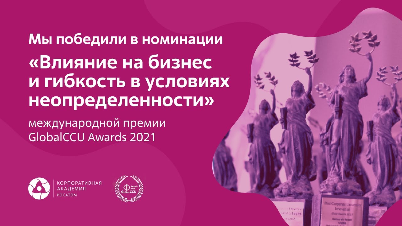5 мая 2021 года Корпоративная Академия Росатома была удостоена престижной международной премии GlobalCCU Awards (Global Council of Corporate Universities). Академия заняла первое место и получила золотую награду в номинации «Влияние на бизнес и гибкость в условиях неопределенности». Награждение состоялось в рамках Форума GlobalCCU 2021, собравшего на онлайн-площадке лидеров крупнейших корпоративных университетов со всего мира. Всего награды получили 17 лучших корпоративных университетов из 8 стран. В рамках деловой программы Форума более десятка экспертов в области корпоративного обучения поделились лучшими практиками и методиками обучения и развития персонала. Генеральный директор Корпоративной Академии Росатома Юлия Ужакина выступила на сессии, посвященной адаптации корпоративных университетов к новым условиям функционирования во время пандемии. Стартовавшие в Росатоме сессии «Моя лучшая ошибка» были удостоены особого внимания международного сообщества за их вклад в построение открытой культуры. #АкадемияРосатома #БесконечноеРазвитие