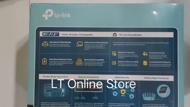 https://ltonlinestore.com/TP-Link-Archer-AX90-AX6600-Tri-Band-Gigabit-Wi-Fi-6-Wireless-WiFi-Router-p427552558 What is in the box? Wi-Fi Router Archer AX90 Power Adapter RJ45 Ethernet Cable Quick Installation Guide From the manufacturer TP-LINK TPLINK ARCHER AX90 WI-FI 6 WIFI WIRELESS ROUTER TRI-BAND GIGABIT CPU OFDMA MU-MIMO Upgrade Your WiFi to 6 TP-LINK TPLINK ARCHER AX90 WI-FI 6 WIFI WIRELESS ROUTER TRI-BAND GIGABIT CPU OFDMA MU-MIMO TP-LINK TPLINK ARCHER AX90 WI-FI 6 WIFI WIRELESS ROUTER TRI-BAND GIGABIT CPU OFDMA MU-MIMO TP-LINK TPLINK ARCHER AX90 WI-FI 6 WIFI WIRELESS ROUTER TRI-BAND GIGABIT CPU OFDMA MU-MIMO Ideal for Your Latest Phones and Laptops The new generation of phones—such as iPhone 11, Galaxy Note 10, and Galaxy S10—and laptops already support WiFi 6, with many more on the way. Your router should, too. WiFi 6 holds great promise to future-proof your home network for the next several years. Now is the best time to embrace this new technology. Powerful and Exquisite Combining Tri-band WiFi with high-tech WiFi 6, Archer AX90 provides eight simultaneous data streams to open up more bandwidth and help your devices operate at full speed. Eight high gain antennas not only deliver boosted WiFi signals to every corner of your home, but also bring a sense of aesthetics. Go Faster— Wired or Wireless In addition to stunning wireless speeds of more than 6.6 Gbps, AX90 also provides premium wired connections. A 2.5 Gbps port and 1 Gbps port make full use of gigabit speeds from your local ISP. Break through the 1G bottleneck and drive your devices to peak performance. WAN/LAN support gives you remarkable flexibility to tailor both ports to fit your network’s needs. Your Security is Our Priority - HomeShield Let the Experts Secure Your Home TP-LINK TPLINK ARCHER AX90 WI-FI 6 WIFI WIRELESS ROUTER TRI-BAND GIGABIT CPU OFDMA MU-MIMO TP-LINK TPLINK ARCHER AX90 WI-FI 6 WIFI WIRELESS ROUTER TRI-BAND GIGABIT CPU OFDMA MU-MIMO TP-LINK TPLINK ARCHER AX90 WI-FI 6 WIFI WIRELESS ROUTER TRI-BAND GIGABIT CPU OFDMA MU-MIMO TP-LINK TPLINK ARCHER AX90 WI-FI 6 WIFI WIRELESS ROUTER TRI-BAND GIGABIT CPU OFDMA MU-MIMO Home Network Scanner The security threats to your home network are continually evolving as your WiFi usage grows. HomeShield provides a home network scanner for your private WiFi to detect potential threats and alert you of security issues. Parental Controls Whether you want to block inappropriate websites, set daily limits for the total time spent online, see which sites your kids are using, or pause the internet, you can do it with parental controls—all from the convenience of an app. Quality of Service Choose devices or activities you want to prioritize on your network with Quality of Service (QoS). In just a few taps, make sure your laptop or movie stream is first in line for WiFi or Ethernet. Comprehensive Reports HomeShield constantly monitors your home network security, keeps an eye on your WiFi usage, and generates weekly and monthly reports. This helps you gain insight and better control of your home network. TP-Link OneMesh : Flexibly Create Whole Home WiFi with Archer AX90 TP-LINK TPLINK ARCHER AX90 WI-FI 6 WIFI WIRELESS ROUTER TRI-BAND GIGABIT CPU OFDMA MU-MIMO TP-LINK TPLINK ARCHER AX90 WI-FI 6 WIFI WIRELESS ROUTER TRI-BAND GIGABIT CPU OFDMA MU-MIMO TP-LINK TPLINK ARCHER AX90 WI-FI 6 WIFI WIRELESS ROUTER TRI-BAND GIGABIT CPU OFDMA MU-MIMO TP-LINK TPLINK ARCHER AX90 WI-FI 6 WIFI WIRELESS ROUTER TRI-BAND GIGABIT CPU OFDMA MU-MIMO Wi-Fi Dead-Zone Killer Eliminate weak signal areas with Wi-Fi coverage for the whole house Smart Roaming Uninterrupted streaming when moving around your home One Wi-Fi Name No more switching Wi-Fi network names Unified Management Manage the whole-home Wi-Fi by managing the central node via Tether app/Web UI TP-LINK TPLINK ARCHER AX90 WI-FI 6 WIFI WIRELESS ROUTER TRI-BAND GIGABIT CPU OFDMA MU-MIMO WPA3—Stronger Security for Your Network Building on the widespread adoption of WPA2, the latest WPA3 brings new capabilities to improve cybersecurity. Product information Style name:AX6600 Technical Details Brand TP-Link Manufacturer TP-LINK, TP-Link Technologies Co., Ltd, South Building, No.5 Keyuan Road, Central Zone, Science & Technology Park, Nanshan, Shenzhen, P.R. China Model Archer AX90 Model Name Archer AX90 Product Dimensions 18.4 x 27.7 x 5.7 cm; 900 Grams Item model number Archer AX90 Mounting Hardware Power Adapter, RJ45 Ethernet Cable, Wi-Fi Router Archer AX90, Quick Installation Guide Number Of Items 1 Batteries Required No Data Transfer Rate 1000 Megabits Per Second Wireless Type 802.11n, 802.11ax, 802.11b, 802.11a, 802.11ac Number of Ports 7 Total Usb Ports 2 Connector Type Ethernet Radio Bands Supported Tri-Band Includes Rechargable Battery No Supports Bluetooth Technology No Manufacturer TP-LINK Country of Origin China Item Weight 900 g