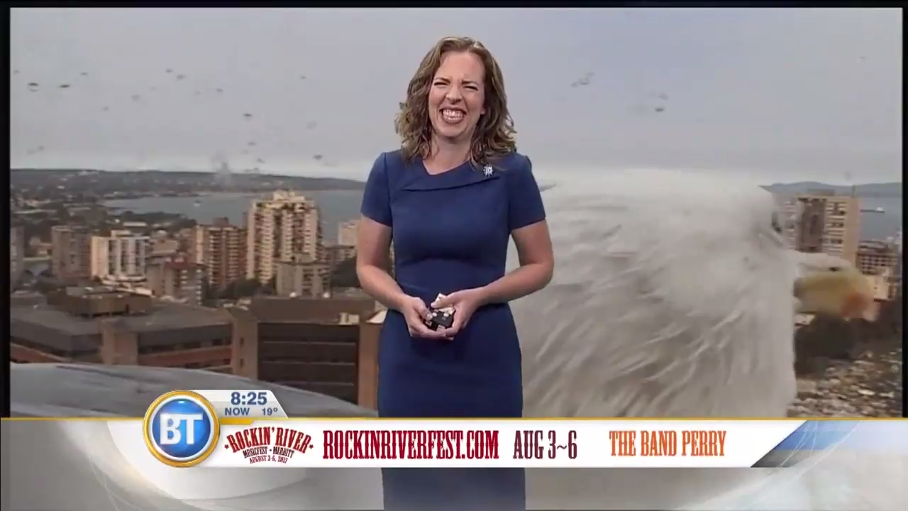 В эфире утреннего шоу Breakfast Television, выходящего на канадском канале City, во время прогноза погоды позади ведущей Тары Джин (Tara Jean) появилась гигантская чайка. Птица уселась возле камеры, транслирующей в студию вид на Ванкувер. #прикол #прямойэфир #чайка