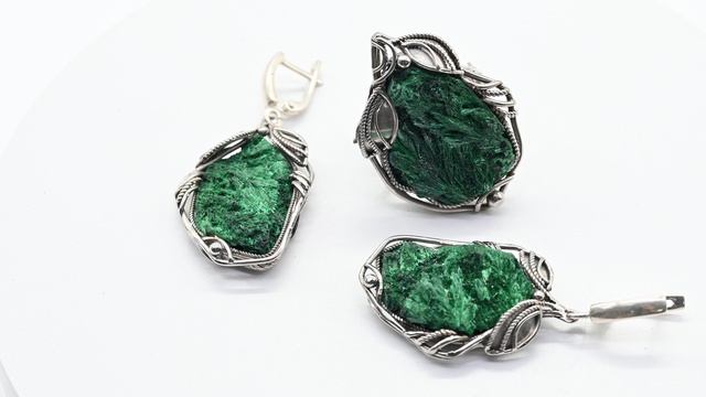 •Авторское украшение ручной работы. Камни установлены в оправу из ювелирного сплава - нейзильбер. •Форма и рисунок камня никогда не повторяются, что делает данное изделие единственным в своем роде. •Габарит кольца 27*37мм, серьги: 24*36мм., вес 18 г •Швензы изготовлены из серебра проба отсутствует. •Указаны габариты серьги без швензы.