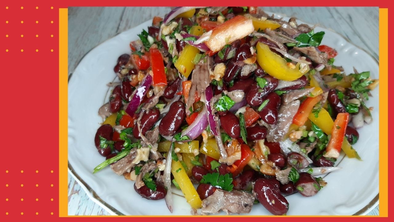 Необычный и вкусный салат Тбилиси с изюминкой. Очень питательный и насыщенный. Ингредиенты: Говядина отварная 200-250гр. фасоль красная консервированная в собственном соку 1банка перец болгарский красный и желтый по половинке грецкие орехи обжаренные на сухой сковородке 50гр. лук фиолетовый 1-2 шт. чеснок 2 зубчика кинза 1 пучок 50-60гр. острый перец чили 1 маленький. (по желанию) растительное масло 4 ст.л. соль перец по вкусу маринование лука: яблочный уксус 2 ст.л. сахар 1 ст.л. вода 150 мл. Приятного аппетита. Удачи Вам на кухне! Подписывайтесь, и ставьте лайки
