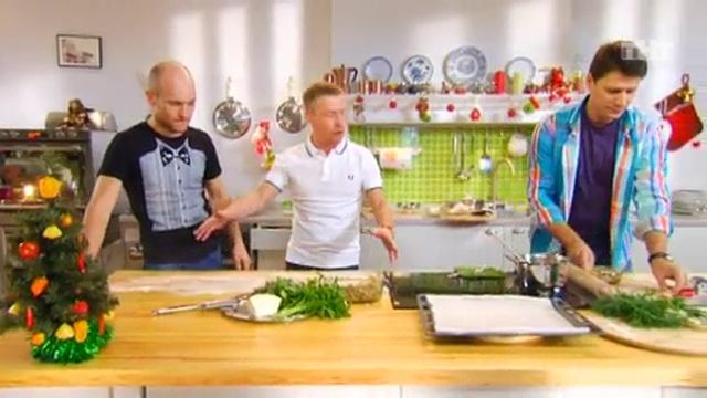 Подготовка к новогоднему столу начинается. В этом выпуске место на кухне займут самые реальные пацаны Антон Богданов и Владимир Селиванов, более известные как Антоха и Вован из сериала "Реальные пацаны". Вместе с ведущим парни приготовят пирожки с тремя начинками, а также молочного поросенка.