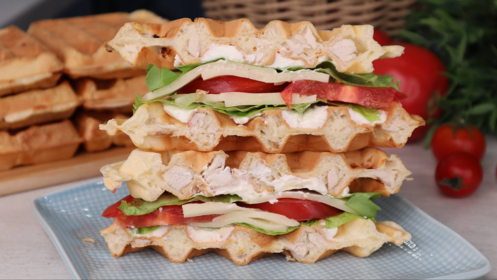 📖Ингредиенты: Яйца: 2шт Соль: 1/3 ч.л Молоко: 100г Сметана: 100г Масло раст.: 2 ст.л Мука: 200г Разрыхлитель: 1 ч.л Куриное филе: 1 крупное Если делать бутерброды (на 1шт): Творожный сыр: 10г Помидоры: 2-3 кружочка Сыр: 2 ломтика Салатные листья: 2-3шт