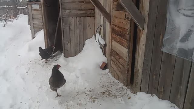 Зима. Куры не очень хотят гулять по снегу.