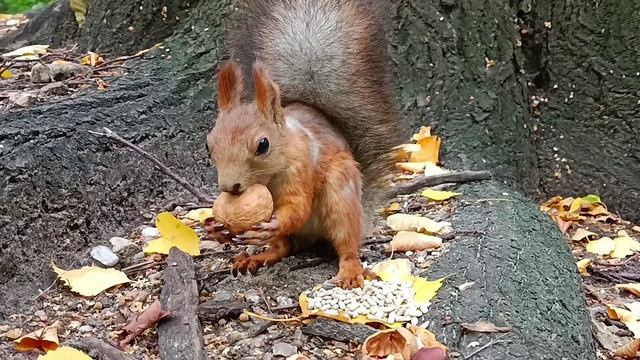 Белка схватила орех и бежать