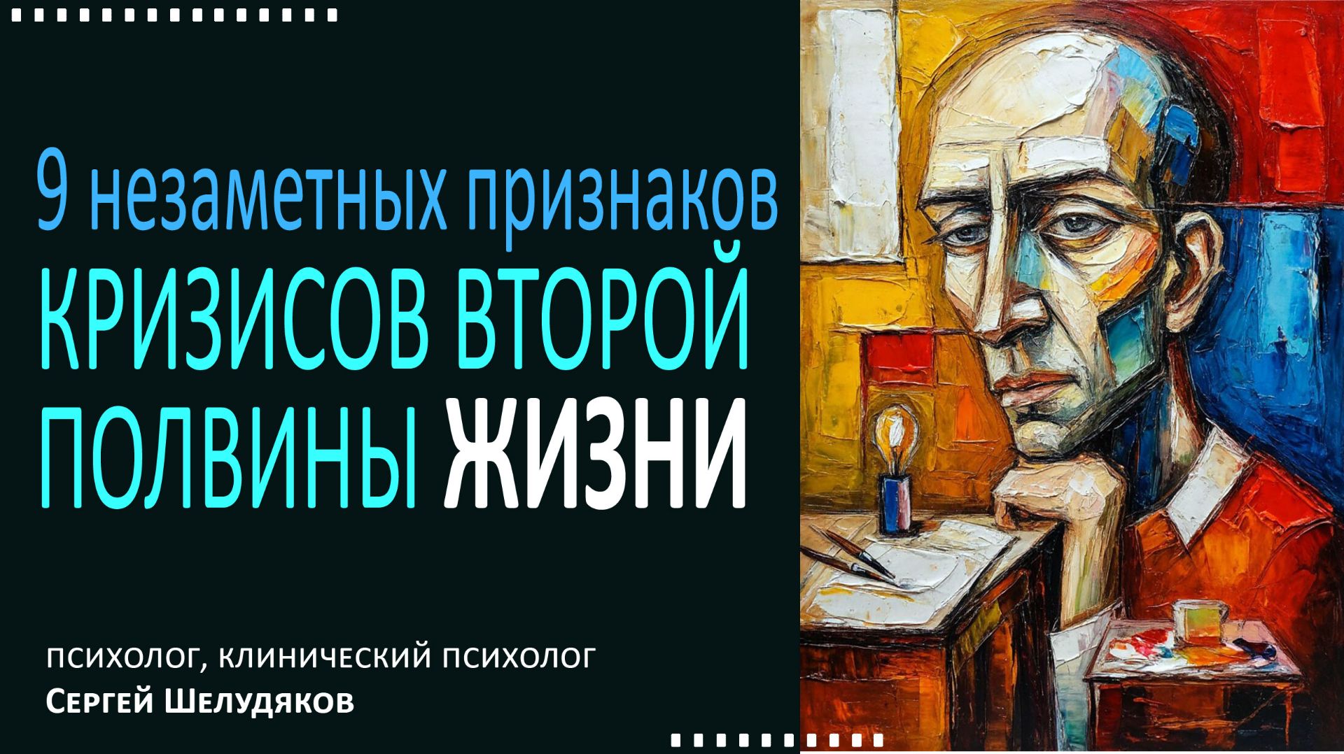 В видео я рассказываю о внутренних, неочевидных признаках не только кризиса среднего возраста, а об общих состояниях и мыслях, посещающих людей после 35 лет. Естественно, 1 признак не говорит о том, что у вас кризис того или иного возраста по негативному варианту, но чем больше признаков - тем больше шанс и выраженность именно того, что вы живете куда-то не туда. Таймкоды: 00:00 - Вступление 02:34 - 1: Пропала перспектива жизни. 03:56 - 2: Завсить. 04:27 - 3: Плоды бурной молодости и психосоматика. 06:13 - 4: Эффект самозванца (не спутаете с самооценкой) 07:40 - 5: Изменение отношения к интиму. 08:59 - 6: Двойное отношение к родителям. 09:23 - 7: Не успеваете за модными тенденциями. 10:36 - 8: Желание резких перемен и одновременно страх перемен. 12:03 - 8: Фоновая необъяснимая тоска и напряжение. 13:03 - Что делать, если кризисы становятся невыносимыми? Спасибо за внимание. Чтоб проще было отвечать на ваши вопросы - ставьте тайм-код того места, к которому задаете вопрос. Делитесь роликом с друзьями и в соц.сетях. Это очень помогает в продвижении канала. Написать мне лично можно воспользовавшись ссылками в профиле, в вк: https://vk.com/psychotherapy_shell И на б17: https://www. b17.ru/shell/?prt=65459