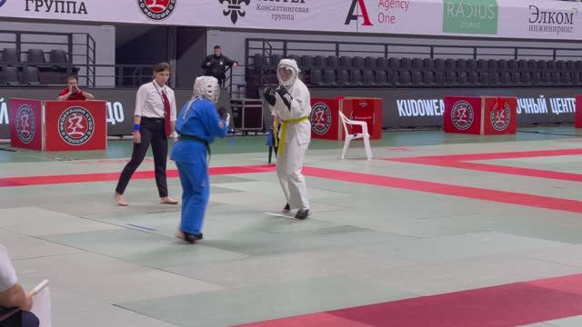 01.12.2024 прошло Первенство России по кудо. Бой в категории девушки 200+ ед. 12-13 лет. В синем Валентина Барынина (г. Москва, СК «Братство»), в белом Элиза Новожилова (г. Москва, СК «Прайд»).