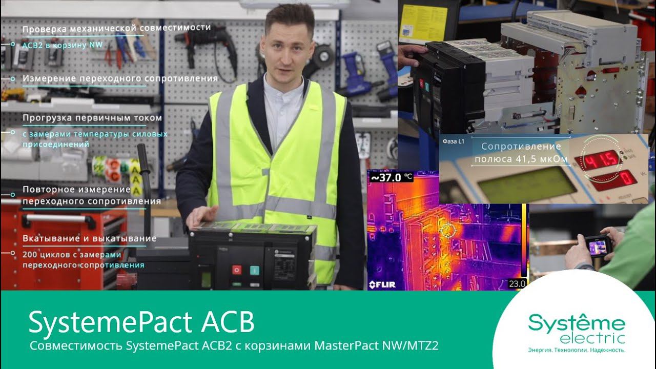 Уважаемые зрители, предлагаем вашему вниманию второе видео с проверкой совместимости уже воздушных автоматических выключателей SystemePact ACB2 (на токи до 4000А) и корзин от аппаратов MasterPact NW/MTZ2. Мы проверили механическую совместимость и работоспособность под нагрузкой, а также провели измерения переходного сопротивления полюсов - как у аппарата MasterPact NW, так и у аппарата SystemePact ACB2, установленного в корзину MasterPact NW. Ссылка на видео по проверке совместимости SystemePact ACB1 и корзин от MasterPact NT/MTZ1: https://youtu.be/CIhiGRv-pyY?si=1VVDsevxOT-1bFLk Результаты всех выполненных измерений – по ссылке https://workspace.systeme.ru/s/XtwzYdDPF2BMm8L Внимание! Прежде чем закупать автоматические выключатели для замены, обязательно сверьте номинальные токи заменяемого аппарата. В зависимости от номинала аппарата, корзины могут отличаться количеством кластеров, например, 12 на полюс для 3200А и 14 на полюс для 4000А, а также возможна разная конфигурация задних выводов на шасси – вывода на шасси на 4000А имеют больший габарит для возможности подвода шины необходимого большего сечения. Если закупаемый аппарат имеет отличный номинал от заменяемого, пожалуйста проконсультируйтесь со специалистом! Также, вы можете задавать все интересующие вас вопросы в Центр Поддержки Клиентов по адресу электронной почты: support@systeme.ru. В теме письма укажите: Вопрос по автоматическим выключателям или SystemePact. Или по телефонам: 8 800 200 64 46, +7 495 777 99 88. Также, для обращения в техническую поддержку можно воспользоваться нашим телеграм-ботом: @CCCSupportSysteme_bot