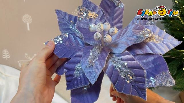 333054 Цветок декоративный Пуансеттия с блестящими серебристыми акцентами сиреневый 50см