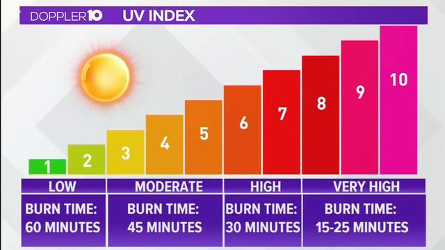 Doppler 10 Futurecaster Lesson | It’s that time of year where you will hear the Doppler 10 weather team talk about the UV Index. It’s a standard measurement of the strength of sunburn-producing ultraviolet radiation at a particular place and time. ... The intensity of UV radiation, and thus the UV Index, depends on several factors: One being the Season. Because of seasonal sun angles -- The UV Index is highest in spring and summer. It goes down in the fall and is the lowest in the winter. Take a look at this chart --- the higher the number on the UV index, the stronger the sun’s rays are going to be and the quicker your skin can burn. When the Index is at a 1 or 2, it can take about an hour for your skin to burn – but when it jumps up to 8 or above – it could take as little as 15 minutes to get sunburn. The basic UV Index forecast is given for solar noon — the sun's highest point in the sky and the time of the highest fluctuation in UV radiation (under clear sky conditions). The SPF on your sunscreen stands for the Sun protection factor. An SPF of 15 blocks 93% of the sun’s UV rays – and SPF of 50 blocks 98% of those rays.
