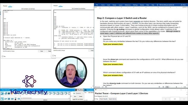 In this episode we are going to look at configuring Compare Layer 2 and Layer 3 Devices. In this activity, we will use various commands to examine three different switching topologies and compare the similarities and differences between the 2960 and 3650 switches. We will also compare the routing table of a 4321 router with that of a 3650 switch. We will Compare Layer 2 and Layer 3 Switches and Compare a Layer 3 Switch and a Router. Thank you so much for watching this episode of my series on Configuration Examples for the Cisco Certified Network Associate (CCNA). Once again, I’m Kevin and this is KevTechify. Let’s get this adventure started. All my details and contact information can be found on my website, https://KevTechify.com YouTube Channel: https://YouTube.com/KevTechify ------------------------------------------------------- Cisco Certified Network Associate (CCNA) Enterprise Networking, Security, and Automation v3 (ENSA) Network Management Packet Tracer Lab 11.5.1 - Compare Layer 2 and Layer 3 Devices Lab Number: 87 ------------------------------------------------------- Equipment I like. Home Lab ►► https://kit.co/KevTechify/home-lab Networking Tools ►► https://kit.co/KevTechify/networking-tools Studio Equipment ►► https://kit.co/KevTechify/studio-equipment
