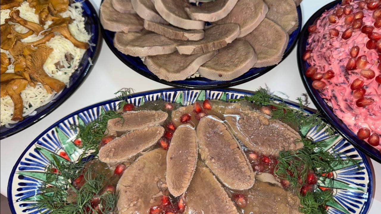 Говяжий, отварной язык - четыре блюда и полный стол.