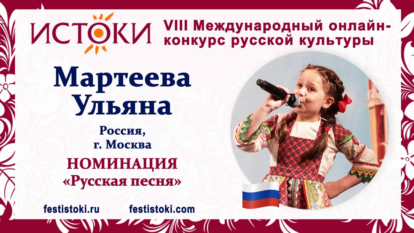 Участник VIII Международного онлайн-конкурса русской культуры "Истоки". Номинация "Русская песня". Русская народная песня "Я на горку шла". Сайт: festistoki.ru / festistoki.com E-mail: festistoki@mail.ru
