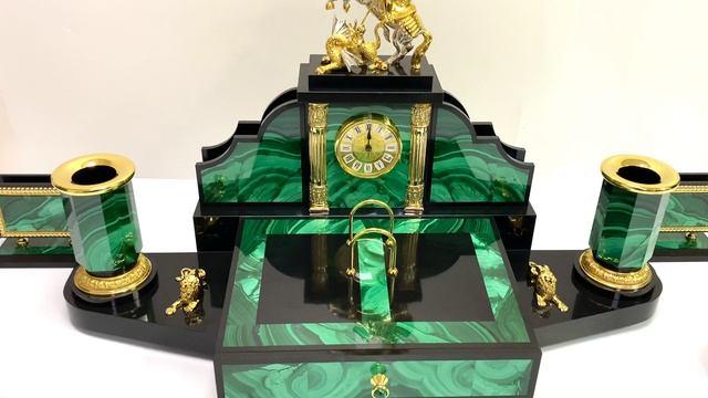 •Материал: малахит, долерит, бронза, латунь. •Содержание драгоценных металлов: никель, золото (999,9)-5мкм. •Техника исполнения: камнерезные работы, никелирование, золочение. •Упаковано в деревянный кейс обтянутый искусственной кожей. •Письменный прибор изготовлен вручную из природного камня малахит и долерит с применением художественного литья из бронзы, элементов из латуни с гальваническим покрытием никель и золото. Установлен качественный кварцевый механизм (Германия). •Размер основания прибора 615*305*400мм. •Размер визитницы 115*65*104мм. 2шт. •Размер флагштока 65*65*275мм. •Размер подставки с ручкой 65*65*210мм. •Размер чемодана 710*350*470мм. •Вес нетто 21,3кг. •Вес брутто 32кг. Цена: 415 000 руб https://radugakamnya.ru/catalog/suveniry_iz_kamnya/suveniry_iz_malakhita/nastolnye_pribory_iz_malakhita/nastolnyy_nabor_iz_malakhita_georgiy_pobedonosets_860_305_400mm-542385/
