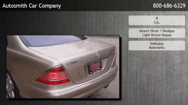 For our most current price click here: http://www.autosinboston.com/Used-2004-Mercedes-Benz-S500-For-Sale/VehicleDetails.aspx?did=2580&av=aa930eef-e119-4226-aff3-ecd7c2140c1a&ips_ls=4 Autosmith Car Company is offering a 2004 Mercedes-Benz S500 --LUXURIOUS!!!!!!!!!!!!!!!!!!! in Epsom, NH. Stock Number: 4695 Engine: 8 Cyl. Transmission: Shiftable Automatic Exterior Color: Desert Silver Interior Color: Designo Light Brown Nappa Mileage: 83962 shiftable automatic 8 cyl. rear wheel drive bucket seats cruise control leather seats navigation system power driver seat power passenger seat heated mirrors sun/moonroof active suspension adjustable steering wheel air suspension engine immobilizer gasoline fuel power door locks power steering power windows security system traction control driver air bag front head air bag front side air bag passenger air bag passenger air bag sensor rear head air bag rear side air bag Autosmith Car Company 96 Old Turnpike Rd Epsom,NH 03242 http://www.autosinboston.com http://www.autosinboston.com/Used-2004-Mercedes-Benz-S500-For-Sale/VehicleDetails.aspx?did=2580&av=aa930eef-e119-4226-aff3-ecd7c2140c1a&ips_ls=4