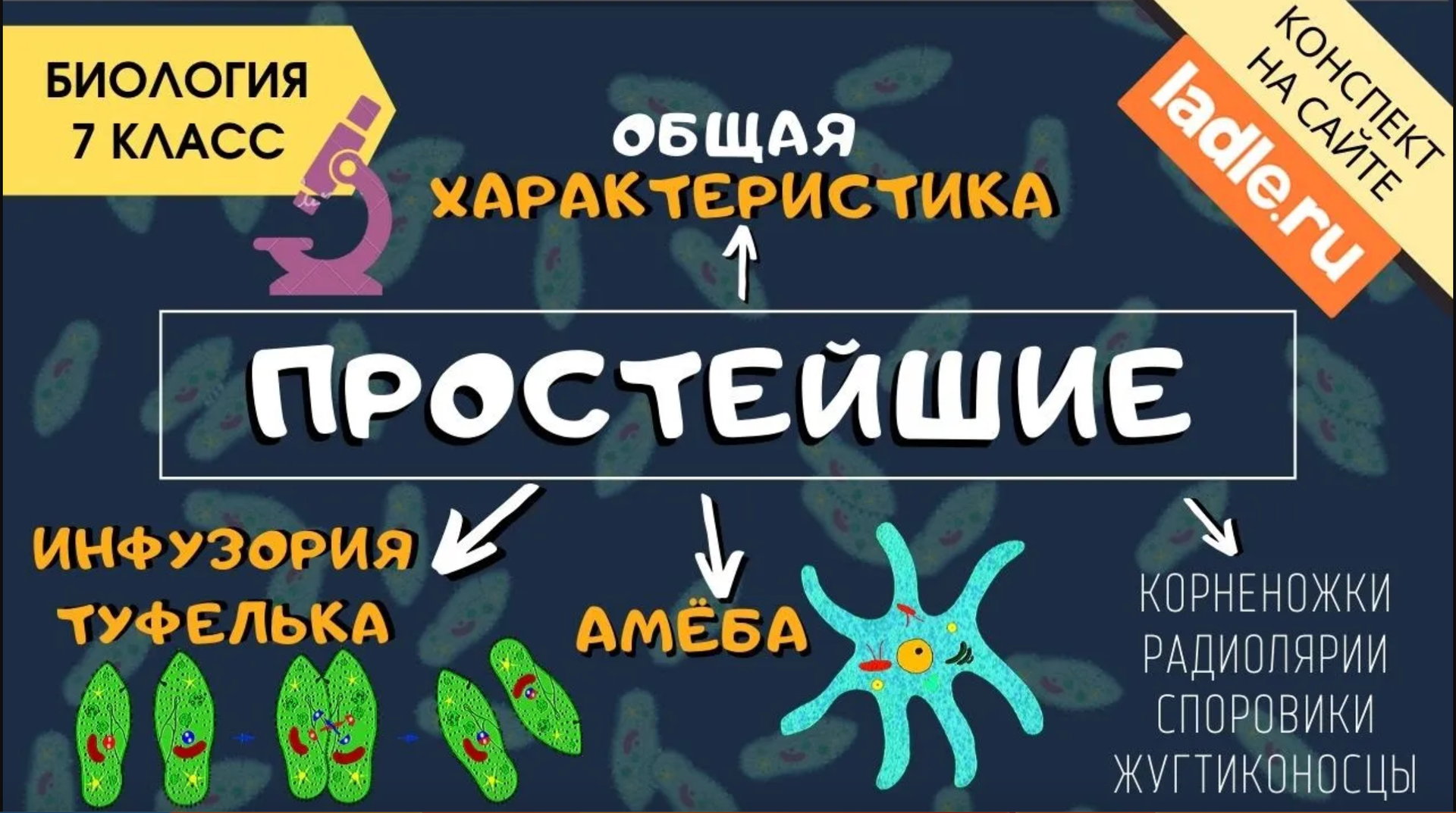 Видеоурок биологии. Тема: "Простейшие. Типы питания. Гетеротрофы и автотрофы. Одноклеточные животные. Царство Эукариоты. Простейшие организмы. Общая характеристики простейших. Представители: Корненожки, радиолярии, солнечники, амебы, жгутиконосцы, инфузории, споровики." Конспект урока и тесты для проверки на сайте https://ladle.ru/education/biologiya/7class/33-prostejshie Биология 6 класс https://ladle.ru/education/biologiya/6class Биология 7 класс https://ladle.ru/education/biologiya/7class Биология 8 класс https://ladle.ru/education/biologiya/8class Тесты ЕГЭ https://ladle.ru/education/biologiya/ege Эукариотические организмы - примитивные живые существа, состоящие из одной клетки, имеющей настоящее ядро. Они были предками всех животных и растений, а их прямые потомки дожили до наших дней в виде разнообразных форм простейших организмов: корненожек, радиолярий, солнечников, споровиков, жгутиконосцев и инфузорий. Одноклеточные - это целостный организм, который состоит из одной клетки. Общая характеристика простейших. Простейших относят к царству Эукариот. Подцарство (группа) Простейшие. Простейшие - одноклеточные существа с гетеротрофным типом питания, имеющие настоящее клеточное ядро, для развития которых необходима жидкая среда. Автотрофы и гетеротрофы. Гетеротрофы в отличие от автотрофов не фотосинтезируют, а потребляют готовые органические вещества. Строение простейших подробно описано на сайте https://ladle.ru/education/biologiya/7class/33-prostejshie Корненожки, радиолярии, солнечники, амебы. Клетки корненожек, радиолярий и солнечников образуют особые выросты, функции которых в основном сводятся к передвижению и захвату пищи: - у корненожек это ложноножки - выросты непостоянной формы, образующиеся на открытых участках тела - у радиолярий и солнечников- это аксоподии - лучевые выросты, обеспечивающие парение в воде и доставку мелких пищевых частиц Амеба. Амеба - очень просто устроенное животное, лишенное скелета. На теле амебы постоянно образуются псевдоподии - ложные ножки, меняющие свою форму. Псевдоподии - это выросты, с помощью которых амебы передвигаются и захватывают пищу. Жгутиконосцы. Жгутиконосцы - обычно мелкие простейшие, использующие жгутики для передвижения или создания токов воды, приносящих пищу. Инфузории. Инфузории - наиболее сложно устроенные простейшие. Были первоначально обнаружены в травяных настойках (инфузиях), отсюда их название. Среди инфузорий есть как одиночные, так и колониальные формы. Строение инфузории очень хорошо описано на сайте https://ladle.ru/education/biologiya/7class/33-prostejshie Споровики. В группу споровиков объединяют простейших, перешедших к паразитическому образу жизни, вследствие чего их строение крайне упростилось https://ladle.ru/education/biologiya/7class/33-prostejshie В жизненном цикле споровиков обычно чередуются стадии бесполого и полового размножения, часто протекающие со сменой хозяев 0:00 начало видео 0:16 Простейшие – это 0:57 Эукариоты – это… 2:27 Тип питания 2:52 Гетеротрофы 3:05 Эвглена 3:37 Пелликула 4:00 Вакуоль 4:43 Особенности и строение простейших 5:24 Амёба 6:26 Фагоцитоз, пиноцитоз 6:57 Инфузории или ресничные #биология #уроки #видеоуроки #зоология #егэ#егэбиология #огэ#егэ#огэбиология