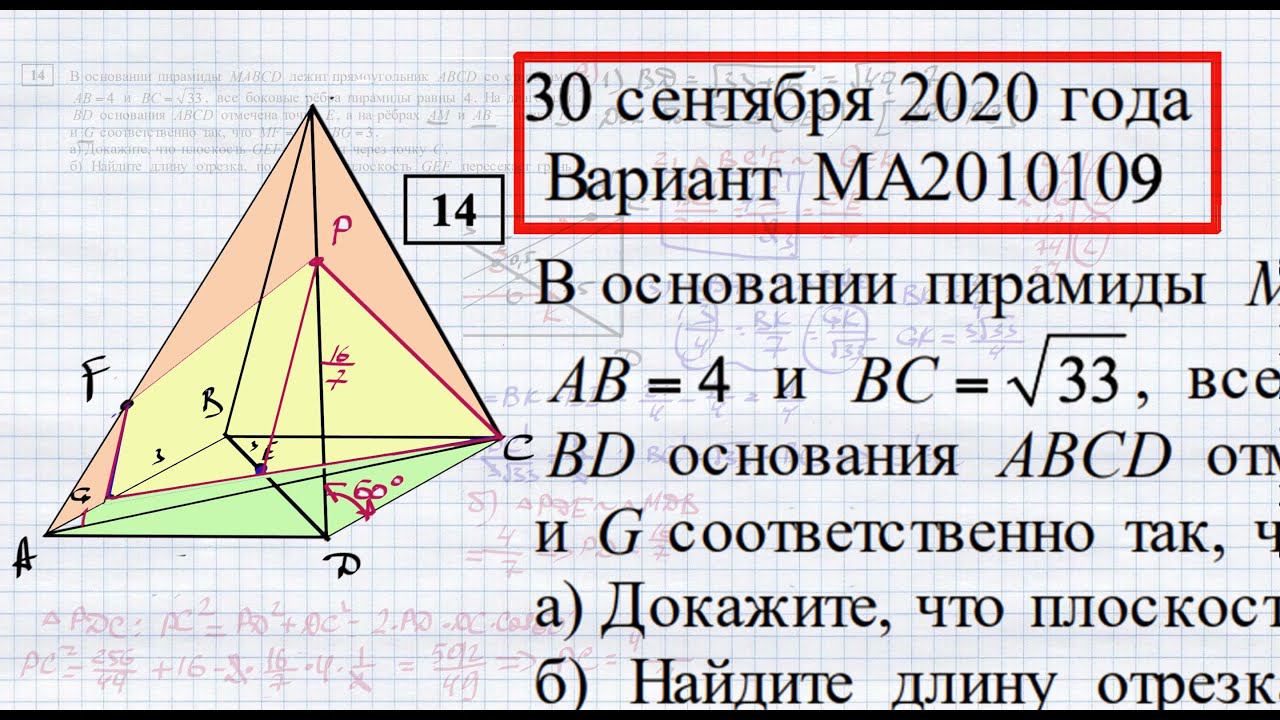 В основании пирамиды MABCD лежит прямоугольник ABCD со сторонами AB = 4 и BC = 33, все боковые рёбра пирамиды равны 4. На диагонали BD основания ABCD отмечена точка E, а на рёбрах AM и AB — точки F и G соответственно так, что MF= BE= BG = 3. а) Докажите, что плоскость GEF проходит через точку C. б) Найдите длину отрезка, по которому плоскость GEF пересекает грань CMD пирамиды. 30 сентября 2020 года Вариант МА2010109 TikTok - https://vm.tiktok.com/WJJwK9 Like - https://likee.com/user/@ge0metriya Мой второй канал для подготовки к ЕГЭ и ОГЭ - https://www.youtube.com/ЕвгенийСумин Инстаграм - https://www.instagram.com/EGE_OGE.math Личный инстаграм - https://www.instagram.com/ee_sumin VK - https://vk.com/evgeniysumin FB - https://www.facebook.com/EvgeniySumin
