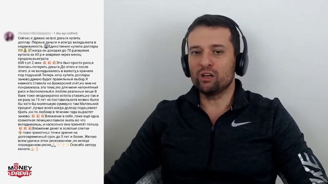 👉 Сегодня Тимур отвечает на комментарий к видео: https://youtu.be/VuAymfR0YeY "Сейчас я думаю на все деньги купить доллар .Первые деньги я всегда вкладывала в недвижимость.🏢 Единственно купила доллары💵💰💸когда он доходил до 70 р, вовремя купила за 63 р и вовремя через месяц продала - выиграла 600 т., от 2 млн.💥💥💥 Это был просто риск, я боялась потерять деньги. До этого и после этого я не вкладывалась в валюту, а хранила под подушкой. Теперь хочу купить доллары заново, думаю будет правильный выбор. Я немного ставила на брокерский счёт, но мне не понравилась эта тема, это для меня непонятный и бесполезный риск, я люблю реальные вещи. В банк тоже неоднократно хотела положить ,но так и ни разу за 15 лет не положила, хотя можно было хотя бы маленькую сумму, но там Маленький процент, лучше всего когда доллар подешевеет брать, он по-любому в течении года вырастет заново.💥💥💥 Вложение в себя, тоже ещё одна грамотная позиция, главное знать во что вкладываешь, и насколько она принесёт пользу.💥💥💥Вложение денег в золотые слитки ⚜️тоже грамотно, с точки зрения на долговременный срок до 5 лет и более. Желаю всем удачи в этом рискованном, но иногда оправданном риске🙏🏻✨✨✨ Спасибо автору канала 👍🏻👌🏻 " ------------- В тему: 👉 https://moneypapa.ru/voprosy-po-iis/ 👉 https://moneypapa.ru/kak-pravilno-vybrat-luchshego-brokera-dlya-torgovli-na-fondovom-rynke-birzhe-i-iis/ ------------- 1️⃣ Друзья, пожалуйста: - подписываемся на этот канал - ставим лайк видео и - пишем комментарий если услышали что-то полезное! ------------- 2️⃣ Не забудьте подписаться на главный канал Манипапа: 👉 https://moneypapa.ru/youtube ------------- 3️⃣ Будем на связи! youtube канал - https://moneypapa.ru/youtube быть в курсе всего - https://moneypapa.ru/podpiska платные продукты - https://moneypapa.ru/magazin тренинг по финансам - https://moneypapa.ru/trening самое новое - https://moneypapa.ru/facebook самое личное - https://moneypapa.ru/instagram ------------- Тимур Мазаев. MoneyPapa