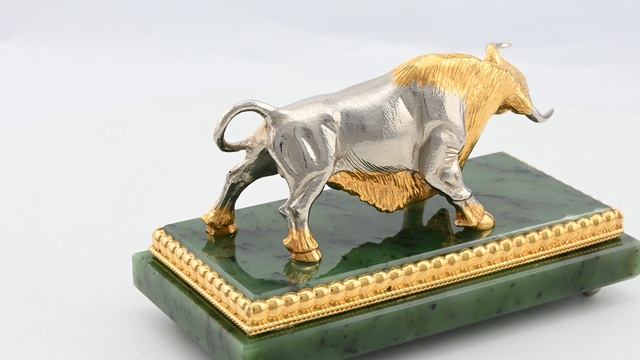 •Статуэтка "Бык" на подставке из нефрита — это эксклюзивное изделие, созданное в технике художественного литья с ручной обработкой, дополненное ювелирным покрытием. Мастерство исполнения и благородные материалы делают её изысканным коллекционным предметом или премиальным подарком. •Техника исполнения: - Бронзовое художественное литьё с филигранной ручной доработкой. - Гальваническое покрытие никель, золото 999,9 пробы (5 мкм). - Ювелирная ручная полировка для безупречного блеска. - Камнерезные работы •Вес: - Нетто: 1,065 кг. - Брутто (с упаковкой): 1,6 кг. •Упаковка: шпонированная коробка с ложементом. •Особенности: - Уникальная детализация: каждая линия и текстура проработаны вручную. - Сочетание массивности литья и изящества ювелирного покрытия. - Подставка из нефрита усиливает статусность и гармонично дополняет композицию. •Идеально для ценителей элитного декора, инвесторов в искусство и корпоративных наград.