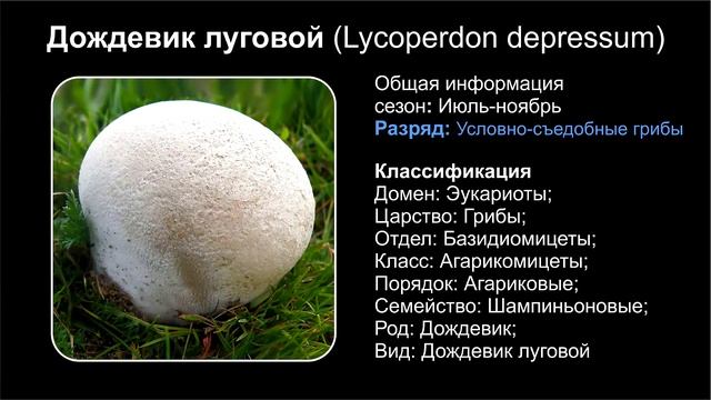 Топ 10 РАЗНОВИДНОСТЕЙ ГРИБОВ ДОЖДЕВИК 00:02 Дождевик вонючий (Lycoperdon nigrescens) 01:00 Дождевик грушевидный (Lycoperdon pyriforme) 02:00 Дождевик ежевидно-колючий (Lycoperdon echinatum) 03:00 Дождевик жёлтоокрашенный (Lycoperdon flavotinctum) 04:00 Дождевик клочковатый (Lycoperdon mammiforme) 05:00 Дождевик луговой (Lycoperdon depressum) 06:00 Дождевик съедобный (Lycoperdon perlatum) 07:00 Ложнодождевик бородавчатый (Scleroderma verrucosum) 08:00 Ложнодождевик обыкновенный (Scleroderma citrinum) 09:00 Ложнодождевик пятнистый (Scleroderma areolatum) Дождевик вонючий (Lycoperdon nigrescens) Дождевик вонючий является несъедобным. Его нельзя употреблять в пищу как свежим, так и после переработки. Даже молодые экземпляры со светлой мякотью непригодны в пищу, в отличие от других сородичей этого семейства. Однако учитывая характерный запах гриба, вряд ли кому-то придет в голову мысль его собирать. Дождевик грушевидный (Lycoperdon pyriforme) Как и все прочие дождевики, Lycoperdon pyriforme можно есть, пока его мякоть не начала темнеть. Впрочем, насчет целесообразности употребления дождевиков в пищу мнения бытуют самые разные. Дождевик ежевидно-колючий (Lycoperdon echinatum) Съедобен, пока сохраняет белизну. Редкий гриб! Дождевик шиповатый съедобен в молодом возрасте, относится к четвёртой категории. Гриб употребляется варёным и сушёным. Дождевик жёлтоокрашенный (Lycoperdon flavotinctum) Съедобен в молодом возрасте, как и другие съедобные дождевики: пока мякоть белая и плотная, не превратилась в порошок. Дождевик клочковатый (Lycoperdon mammiforme) Дождевик клочковатый относят к числу съедобных разновидностей, но употреблять в пищу рекомендуется только молодые грибы. К таким относят экземпляры, у которых еще не образовались споры – мякоть у них мягкая нежная и сочная. Дождевик луговой (Lycoperdon depressum) По своим вкусовым качествам луговой дождевик относят к четвертой категории. Несмотря на это, его не запрещено употреблять в пищу. Гурманы часто сравнивают этот вид с подосиновиками. Перед употреблением в пищу необходимо убедиться, что урожай не был собран вблизи промышленных объектов и автомобильных дорог. Дело в том, что грибы обладают способностью впитывать в себя токсические вещества. Дождевик съедобный (Lycoperdon perlatum) Дождевик съедобный фигурирует под многими названиями, его именуют также настоящим или жемчужным дождевиком, шиповатым дождевиком. В народе распространены такие названия, как заячья картошка, дедушкин табак или пылевик, чертово яблоко или табачный гриб. Ложнодождевик бородавчатый (Scleroderma verrucosum) Этот гриб относится к категории несъедобных. Но при этом характеризуется слабой токсичностью, поэтому его можно применять в незначительных дозах как пряность. Употребление в больших количествах вызывает пищевое отравление, которое сопровождается головокружением, тошнотой, рвотой. Ложнодождевик обыкновенный (Scleroderma citrinum) Ложнодождевики относятся к несъедобны