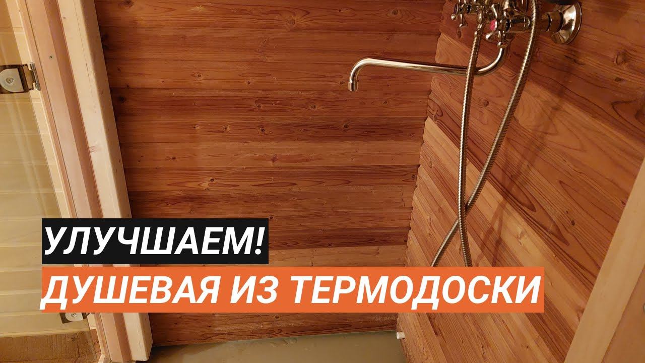 Попробовали обшить душевое помещение термодоской — она не впитывает воду, а значит не создаёт лишних проблем. И вроде получилось весьма неплохо. Можно в пару к душевой обшить термодревесиной и парную — будет вообще огонь! Сама по себе тёмная термомодифицированная доска будет меньше пачкаться и дольше сохранять первозданный вид. Ну и меньше ухода требует. Так что имеет смысл подумать над заказом этой опции.