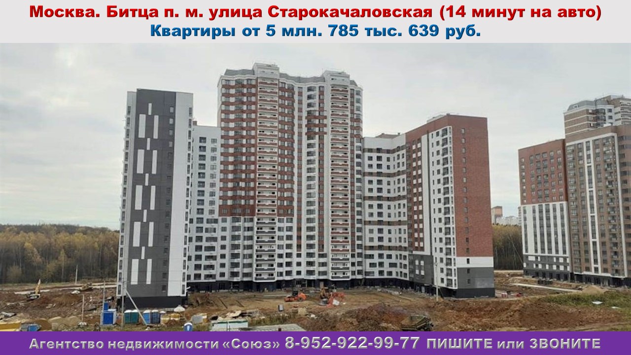 Агентство недвижимости «СОЮЗ» Покупайте: квартиру в Москве. Битца п. м. улица Старокачаловская (14 минут на авто) Агент по новостройкам: 89529229977 (WhatsApp) Цены на квартиры точно такие же как и у застройщика. Вернем кешбэк в размере первоначального взноса по ипотеке за 60 дней. Акция распространяется на ограниченный список квартир и не суммируется с другими скидками и спецпредложениями. В ней участвуют только квартиры от застройщика. Квартиры продаются БЕЗ РИЭЛТОРСКОЙ КОМИССИИ !!!. Студии: от 5 млн. 785 тыс. 639 руб. Ежемесячный платеж: 33 920 руб. при ставке 8% Площадь общая: 22,9 м2- 27,2 м2 1к. квартиры: от 7 млн. 122 тыс. 870 руб. Ежемесячный платеж: 41 760 руб. при ставке 8% Площадь общая: 24,6 м2 - 49,3 м2 2к. квартиры: от 10 млн. 532 тыс. 977 руб. Ежемесячный платеж: 61 753 руб. при ставке 8% Площадь общая: 52,5 м2 - 74 м2 3к. квартиры: от 13 млн. 796 тыс. 815 руб. Ежемесячный платеж: 80 888 руб. при ставке 8% Площадь общая: 62,4 м2 - 86,2 м2 4к. квартиры: от 16 млн. 546 тыс. 145 руб. Ежемесячный платеж: 97 006 руб. при ставке 8% Площадь общая: 87,4 м2 - 109,1 м2 Срок сдачи: 2 квартал 2026 Срок выдачи ключей: 4 квартал 2026 Договор: ДДУ Тип дома: панельный Тип отделки: Подготовка под чистовую отделку Отделка "под ключ" Чистовая отделка Парковка: подземная Потолки: 2,74 м. Преимущества:Транспортная доступность. Близость станций метро. Экологически благоприятный район. Удобные и продуманные планировки квартир. Развитая социальная и коммерческая инфраструктура. Огороженная территория комплекса. Описание комплекса Жилой комплекс расположен в 3 км от МКАД между Варшавским и Симферопольским шоссе, с южной стороны от комплекса находится Бутовский лесопарк, а с западной – район Москвы Северное Бутово. Удобное расположение вблизи трех станций метро (Аннино, Бульвар Дм. Донского, Улица Старокачаловская) обеспечивает жителям хорошую доступность на личном и общественном транспорте. ЖК включает 12 жилых корпусов и всю необходимую социальную инфраструктуру: 4 детских сада (всего на 1300 мест), 2 школы (всего на 2700 мест), площадки для отдыха детей и взрослых, прогулочные зоны, надземные и подземные парковки, встроенные нежилые помещения, поликлиника, торговый центр, коммерческие помещения на первых этажах зданий, искусственный пруд. Современная архитектура домов, продуманное наполнение социальной и коммерческой инфраструктурой, удобная организация внутридворового пространства делают район прекрасным местом для жизни. Природное окружение и красивые виды из окон на лесопарк дополняют преимущества района. Первая очередь строительства включает в себя 3 корпуса ЖК, состоящие из современных серий индустриальных домов ДСК-1. Основные технологические особенности домов ДСК-1: высокая скорость строительства; высокое качество внутренних стеновых панелей и плит перекрытия — квартиры сдаются под чистовую отделку; остекление балконов и лоджий; трехслойные наружные панели отвечают современным стандартам по энергосбережению (как у кирпичной стены 90 см); фасады, облицованные плиткой «под кирпич» различных цветов, сохраняют привлекательный внешний вид на протяжении всего срока эксплуатации дома; корзины для кондиционеров в цвет фасада; вход в подъезды с уровня земли; первые этажи нежилые и предназначены для размещения объектов инфраструктуры; сквозные подъезды позволяют удобнее пользоваться инфраструктурой первых этажей; современные отопительные 