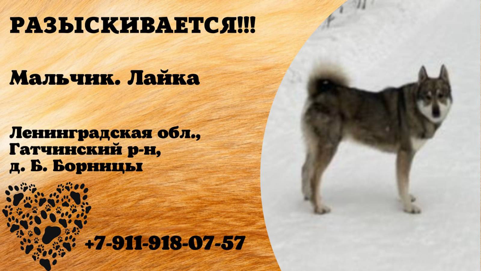 Ленинградская Гатчинский р-н, д. Б. Борницы Пропала собака 24.10.2024 потерялась собака. Лайка,крупный кобель светло-серого окраса,добрый. Просим помочь найти, вознаграждение гарантируем. Татьяна+79119180757 Инфо: https://vk.com/wall-198815410_158702 Автор: https://vk.com/id99143424