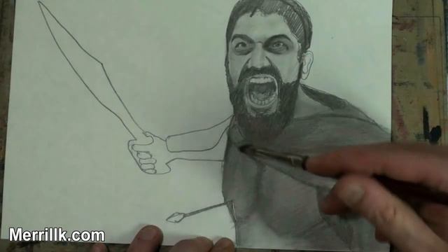 WE NEED A VISUAL ARTS CATEGORY ON YOUTUBE THREAD-http://www.google.com/support/forum/p/youtube/thread?tid=2a9806f929074cbd&hl=en&fid=2a9806f929074cbd0004b630ad37cc3e Facebook- http://facebook.com/kazanjianm Twitter- http://twitter.com/kazanjianm Website- http://merrillk.com (Merrill) Supplies I Use- http://www.jdoqocy.com/click-4247664-805536?url=http%3A%2F%2Fwww.dickblick.com%2Fbundles%2Fbundle.asp%3Fid%3D903 Tonight we dine in Hell. If you are up for the challenge, I will teach you how to draw a very angry greek man who likes to kick people in to bottomless pits. It doesnt matter if you are new to drawing the more you sweat here , the less you'll bleed in battle. Just follow my step by step instructions... and remember...No retreat, no surrender. Our pencils will block out the sun...Then we shall draw in the shade. Merrill.....um this is Madness Madness? THIS IS KAZANJIANM!! Be sure to pause the video at the end of each step. Step 1: Draw in the Beard Shape. Be sure to notice that it is slightly asymetrical. Step 2: Draw in the shape for the hair. Notice that the shapes from steps 1 and 2 are equal in height. Step 3: Draw in the ovals for the eye sockets and the ear shape Step 4: Add the shape for his clothing. This shape does not have to be perfect but notice that it is slightly wider at the neck. Step 5: is a difficult step. The sword shape is slightly taller than the head and it points away from the body and towards the left upper corner of the page. The fingers will be heavily shaded later so it is more important that you focus on the shape of the hand. Take extra time on this step. Step 6: Add some light lines to define the chest and left arm. Do not press hard, just hint at their existence, they will be shaded heavily later. Add an arrow going through Leonidas' chest...... Step 7: Take your time and add the detail to Leonidas' face. Take extra time to observe the placement of the teeth and the eyes. In order to get a likeness this is an important step to conquer. Gerard Butler