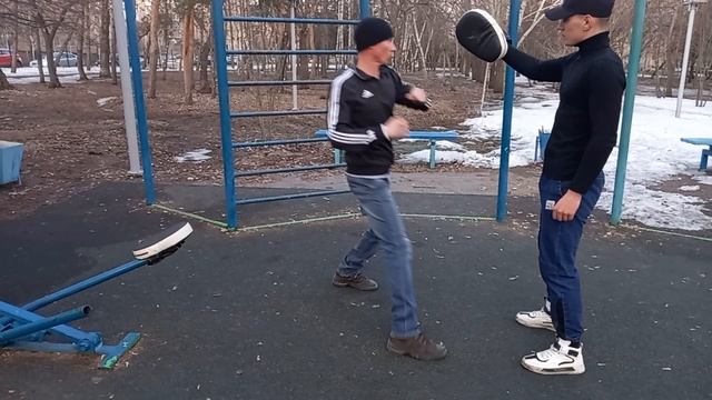 В начале отрабатываем боковой удар рукой по лапам. А потом в комбинации блок с ударом рукой.