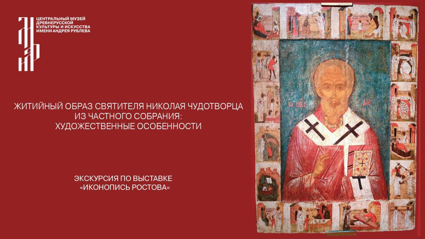 Житийная икона святителя Николая Чудотворца, созданная на рубеже XIV–XV столетий, представлена на временной выставке «Иконопись Ростова. Памятники XIII–XVI веков из музейных и частных собраний». Этот редкий образ демонстрирует выразительные живописные приемы, характерные для местной ростовской культуры. О художественных особенностях образа и стиле живописи расскажет старший научный сотрудник Музея им. Андрея Рублева – Анна Евгеньевна Сажина.