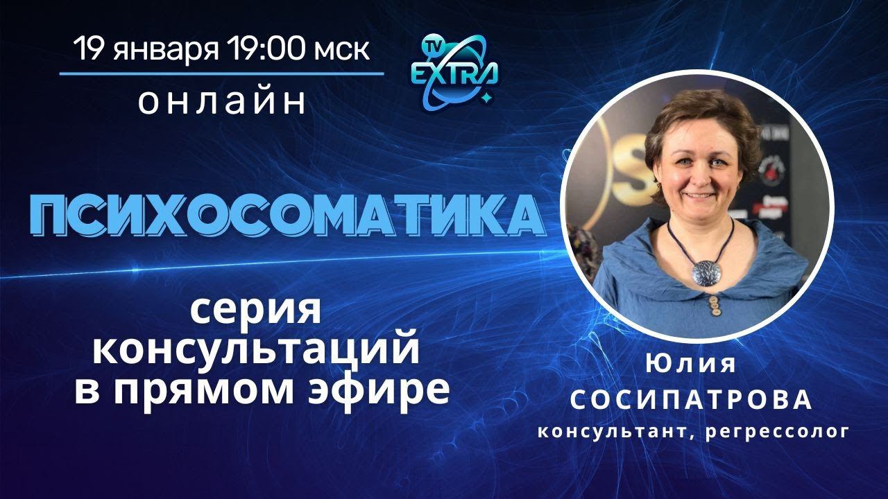 Тематический эфир по психосоматике. Продолжение серии Консультаций в Прямом Эфире. Вопросы можно задавать в прямом эфире или заранее направлять на эл почту: info@probujdenie.ru Ответы на ваши вопросы о симптомах и причинах заболеваний. _____________________ Подробнее о специалисте и консультациях на персональной странице Юлии СОСИПАТРОВОЙ https://probujdenie.ru/persony/julia_sosipatrova/ Мастер-класс с Юлий Сосипатровой в рамках конференции НЕПОЗНАННОЕ "Практическая медитация по работе с препятствиями в жизни" https://probujdenie.ru/master-klassy-konferencii-nepoznannoe-v-zapisi/ ______________________ https://probujdenie.ru/qhht/dolores_cannon_qhht/ - официальное сертифицированное обучение методу Долорес Кэннон QHHT от Академии Долорес ____________ https://www.facebook.com/groups/tvextra/ - группа телеканала в Фейсбук https://t.me/nepoznannoe_online - Группа ТВ Экстра в Телеграм