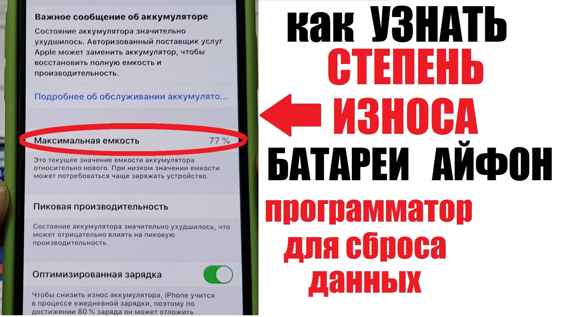 Как легко узнать степень износа батареи на айфон Если батарея iphone быстро разряжается, то уровень износа можно посмотреть в Настройках телефона. Что такое программатор для батарей айфон. На видео показано что можно сделать. наш сайт https://topreset.ru Если интересует что-то другое, то смотрите наш Rutube канал. +++++ Смотреть другие видео с этого канала https://rutube.ru/channel/23501311 + Подписаться на Rutube канал "top reset" https://rutube.ru/channel/23501311 +++++ Как подключить Ноутбук к телевизору. Переходник VGA HDMI конвертер со звуком https://rutube.ru/video/aac01dda2fc3c4a25d4e346d8e0415c1 Не скачивается приложение с Плей Маркета Подождите / PlayMarket не работает https://rutube.ru/video/f9499a76e09a96a130dcad4c8d76b9d8 Как проверить тачскрин Андроид / Не работает сенсор на телефоне https://rutube.ru/video/223c2487f5b7ce4336c3fc20c81c167e Как разделить экран на 2 части Андроид https://rutube.ru/video/4f23d1e6e47cdcc3c418032c660c08ee Как включить блок питания без материнской платы https://rutube.ru/video/1ed0235710895d9532881696239c675d Не работает кнопка включения / Ремонт в домашних условиях https://rutube.ru/video/0937c48fd3b33c329527dd0b18195199 Как включить Honor Huawei БЕЗ КНОПКИ включения https://rutube.ru/video/b0c0f75f2ac31afbf803cb834e1a6546 Как выключить телефон БЕЗ КНОПКИ включения https://rutube.ru/video/5291ea631d8eae6a6f6e1b6b6fbcf521 Как разблокировать и блокировать экран БЕЗ КНОПКИ включения https://rutube.ru/video/3ff695185c1ded92c9af45a1ac3b69fd Как включить Самсунг без кнопки включения / Полезно знать https://rutube.ru/video/5dcf0b4e4a936a6f807c6ba8dde3f05d Самсунг завис. Как перезагрузить телефон. Не реагирует на нажатия по экрану https://rutube.ru/video/29defd40ebb6b6f02023e705c6000123 Как выключить Самсунг если просит пароль https://rutube.ru/video/55931a99211f65b42fd18b5055e7de59 Как включить и выключить Айфон без кнопки https://rutube.ru/video/5cfcc3c90803d567e9de58469195134f Как создать невидимую папку Windows https://rutube.ru/video/92fcc20ba5ba2ac1e52c53ae133e39e1 Корзина в телефоне. Восстанови удаленные фото и видео и файлы https://rutube.ru/video/b89a5407abb635b948f4a43ed22d59f2 Как передать по блютузу с телефона Bluetooth отправка файлов https://rutube.ru/video/602c2d7df856fcc2fc15bdb1cb5c775b Полезная настройка Андроид. Сообщение на экран блокировки https://rutube.ru/video/aafc346875df23554f0f8788a5333b0d Как поменять клавиатуру на телефоне https://rutube.ru/video/655e8b4ec0b67fa0bebb444c2ba96a53 ----- Наш Youtube канал "dok info" https://youtube.com/@dokinfo4 ----- батарея айфон,акб айфон,батарея iphone,аккумулятор айфон,аккумулятор iphone,степень износа батареи,степень износа аккумулятора,уровень износа батареи,как узнать уровень износа батареи,емкость батареи айфон,как узнать емкость батареи айфон,обслуживание аккумулятора,программатор для аккумуляторов,программатор айфон,уровень заряда батареи
