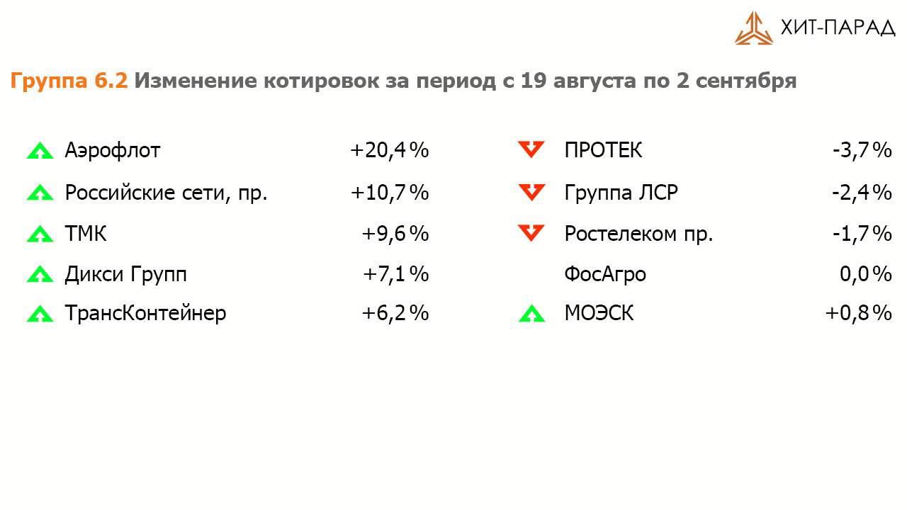 Видеопередача о динамике на рынке акций за 2 недели с 19 августа по 2 сентября года. Хит-парад эмитентов