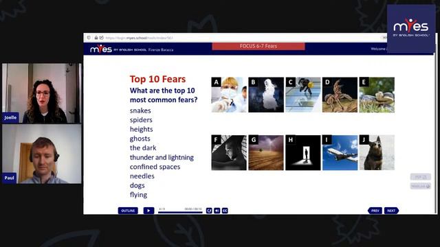 Objectives: • Students will be able to say what they are afraid of • Students will be able to say how they overcame a fear Language objectives: • Practice past simple and past continuous • New vocabulary about fears: ‘to be afraid/scared/frightened/terrified of’, ‘to have goose bumps’, ‘to be scared to death’, ‘the dark’, ‘ghosts’, ‘spiders’, ‘snakes’, ‘heights’, ‘shots’, ‘flying’, ‘thunder and lightning’, ‘overcome’, ‘get over’