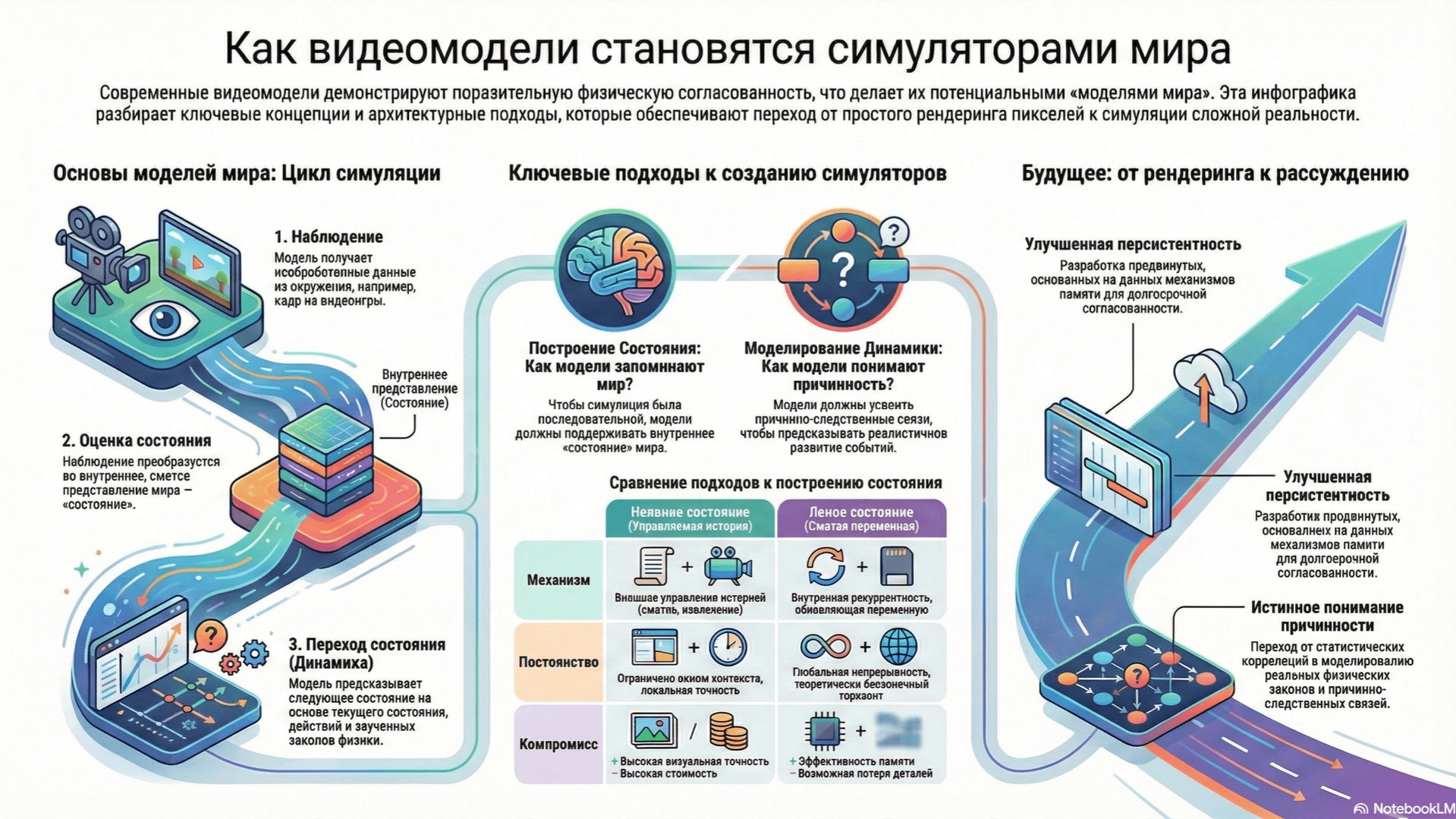 https://arxiv.org/abs/2601.17067v1 Этот научный обзор исследует трансформацию генераторов видео в полноценные модели мира, способные симулировать физическую реальность. Авторы систематизируют современные подходы через две ключевые составляющие: построение состояния и моделирование динамики. В тексте подробно анализируются механизмы памяти, где история наблюдений либо хранится в виде неявного контекста, либо сжимается в явные латентные переменные. Особое внимание уделяется переходу от простого рендеринга пикселей к причинно-следственному прогнозированию с использованием передовых архитектур и больших мультимодальных моделей. В завершение предлагаются новые критерии оценки нейросетей, основанные на физической устойчивости и логике взаимодействия объектов в пространстве.