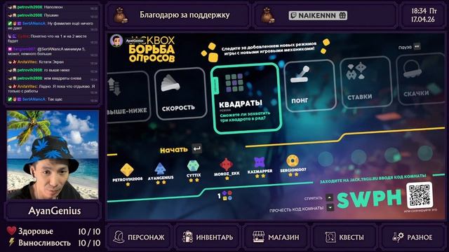 Twich: https://www.twitch.tv/ayangenius Игры покупаю здесь: https://gglead.org/ggsel3/?flow=13207 Rutube: https://rutube.ru/channel/24664371/ Youtube: https://www.youtube.com/@AyanGenius Youtube канал сквада: https://www.youtube.com/@sun_squad_tv Twich сквад: https://www.twitch.tv/team/poshtet Vk video live: https://live.vkvideo.ru/ayangenius 00:00 — Начало стрима, выбор режима и обсуждение новых категорий. 00:48 — Режим "Выше-ниже" (Hilo): Угадываем самые и наименее популярные ответы (тема: "К чаю"). 01:43 — Обсуждение результатов первого раунда (Шоколад, Пряник). 03:12 — Поиск самых редких ответов в списке. 05:44 — Популярные ответы: Молоко и Яйца. Итоговые баллы раунда. 06:56 — Режим "Скорость" (Speedrun): Как много ответов из списка можно раскрыть за время? 09:30 — Результаты скоростного раунда (Пиво, Дед Мороз, Свеча). 10:11 — Режим "Квадраты" (Squares): Командное противостояние (тема: "Бассейны"). 11:47 — Захват квадратов (Шарики, Снег). 14:41 — Режим "Понг" (Bounce): Отбиваем кубики, угадывая ответы (тема: "На прогулке"). 19:07 — Победитель в режиме "Понг". 19:22 — Режим "Ставки" (Bet): Ставим условия другим игрокам (тема: "Журнальные слова"). 21:13 — Сложные условия и неожиданные результаты (Киркоров, Смерть). 24:04 — Финальный раунд ставок с предсказанием точного места. 26:27 — Режим "Скачки" (Dash): Кто быстрее доберется до финиша (тема: "Соль", "Белоснежная улыбка"). 29:40 — Подведение промежуточных итогов и выбор новых тем от зрителей. 30:52 — Повторный раунд в "Квадраты" (тема: "На даче"). 34:57 — Техническая пауза, модерация чата и бан нарушителей. 39:39 — Переигровка "Квадратов": Битва за дачные атрибуты. 43:43 — Снова "Выше-ниже": Спортивные трансляции по ТВ (Футбол, Хоккей, Покер). 52:21 — Еще один раунд "Ставок": Поиск слов в журналах (Иммунитет, Реклама). 01:03:55 — Финальная игра в "Ставки": Ингредиенты сэндвича и вкусы мороженого (от "Шоколада" до "Камня"). 01:15:35 — Финальные результаты стрима и прощание с Jackbox Survey Scramble.