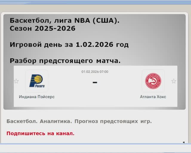 #баскетбол #аналитика #прогноз #тотол #NBA #лига_ВТБ Прогноз на матч 1.02.2026 Баскетбол. Индиана Пэйсерс Атланта Хокс