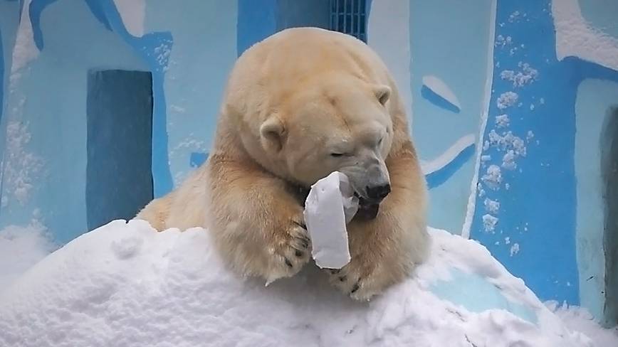 Белый медведь Кай не хочет купаться, но радуется снегу и играет с канистрой.