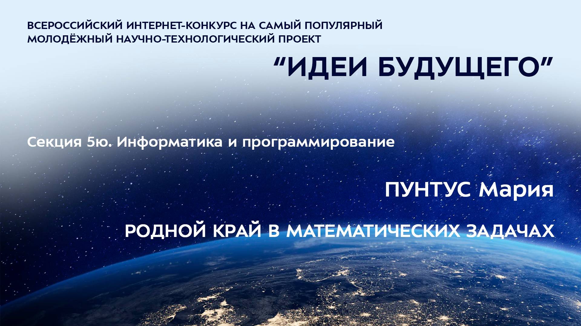 (5Ю-16) ПУНТУС Мария Сергеевна Мурманская область, нп Междуречье МБОУ СОШ н. п. Междуречье, 7 класс РОДНОЙ КРАЙ В МАТЕМАТИЧЕСКИХ ЗАДАЧАХ Научный руководитель: Филатова Светлана Ромуальдовна, Мурманская область, нп Мишуково, МБОУ СОШ н. п. Междуречье Более подробно о мероприятиях Программы "Шаг в будущее" можно узнать на сайтах http://www.step-into-the-future.ru/ и http://шагвбудущее.рф