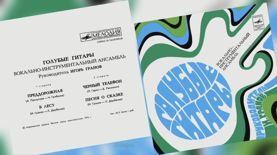 ВИА ГОЛУБЫЕ ГИТАРЫ. 1977 - ПРЕДДОРОЖНАЯ. EP (АОЛЗГ) Мелодия 33 C62-07249-50 Matrix / Runout (Runout side A, stamped): C62-07249/4-1 Matrix / Runout (Runout side B, stamped): C62-07250/4-1 ГОСТ 5289-73 Гр. 3. 0-85 Пластинка, 7", EP, Стерео, 33 1/3, Миньон, Страна: СССР Записан / Выпущен: 1976 / 1977 Жанр,стиль: Популярная песня, ВИА, mp3 320 кбит/сек. 54.7 Mb Продолжительность: 12:56 СОДЕРЖАНИЕ: СТОРОНА 1 01. ПРЕДДОРОЖНАЯ (А. Пахмутова — Н. Грибачев) - 03:17 02. В ЛЕСУ (И. Гранов — Л. Дербенев) - 03:19 СТОРОНА 2 03. ЧЕРНЫЙ ТЕЛЕФОН (Л. Гарин — Б. Рахманин) - 02:40 04. ПЕСНЯ О СКАЗКЕ (И. Гранов — Л. Дербенев) - 03:42 ВИА ГОЛУБЫЕ ГИТАРЫ. Руководитель Игорь Гранов МИНИСТЕРСТВО КУЛЬТУРЫ СССР Всесоюзная фирма грампластинок (С) "Мелодия", Всесоюзная студия грамзаписи. (С) Апрелевский ордена Ленина завод грампластинок. 1976 olryabinin.narod.ru