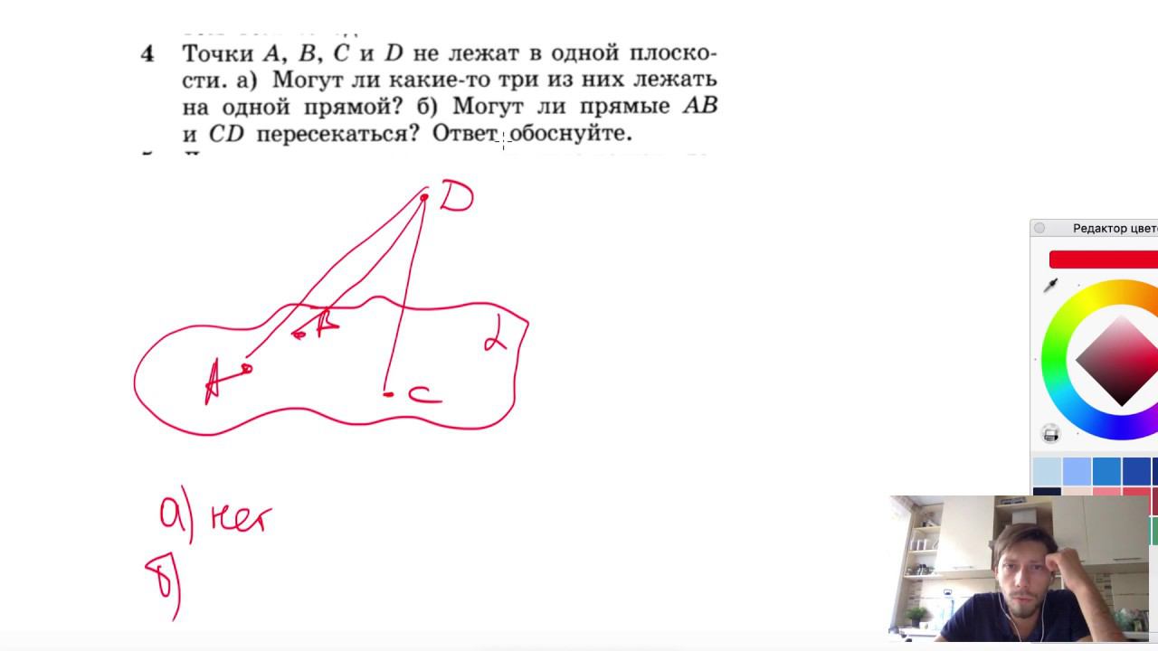 №4. Точки А, В, С и D не лежат в одной плоскости, а) Могут ли какие-то три из них лежать на одной прямой? б) Могут ли прямые АВ и CD пересекаться? Ответ обоснуйте. Мой второй канал для подготовки к ЕГЭ и ОГЭ - https://www.youtube.com/ЕвгенийСумин Инстаграм - https://www.instagram.com/EGE_OGE.math Личный инстаграм - https://www.instagram.com/ee_sumin VK - https://vk.com/evgeniysumin FB - https://www.facebook.com/EvgeniySumin