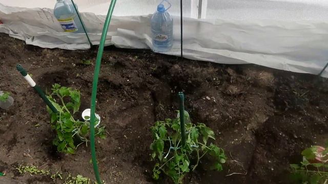Первая высадка томатов в теплицу. Делаю укрытие, чтобы томаты не замёрзли