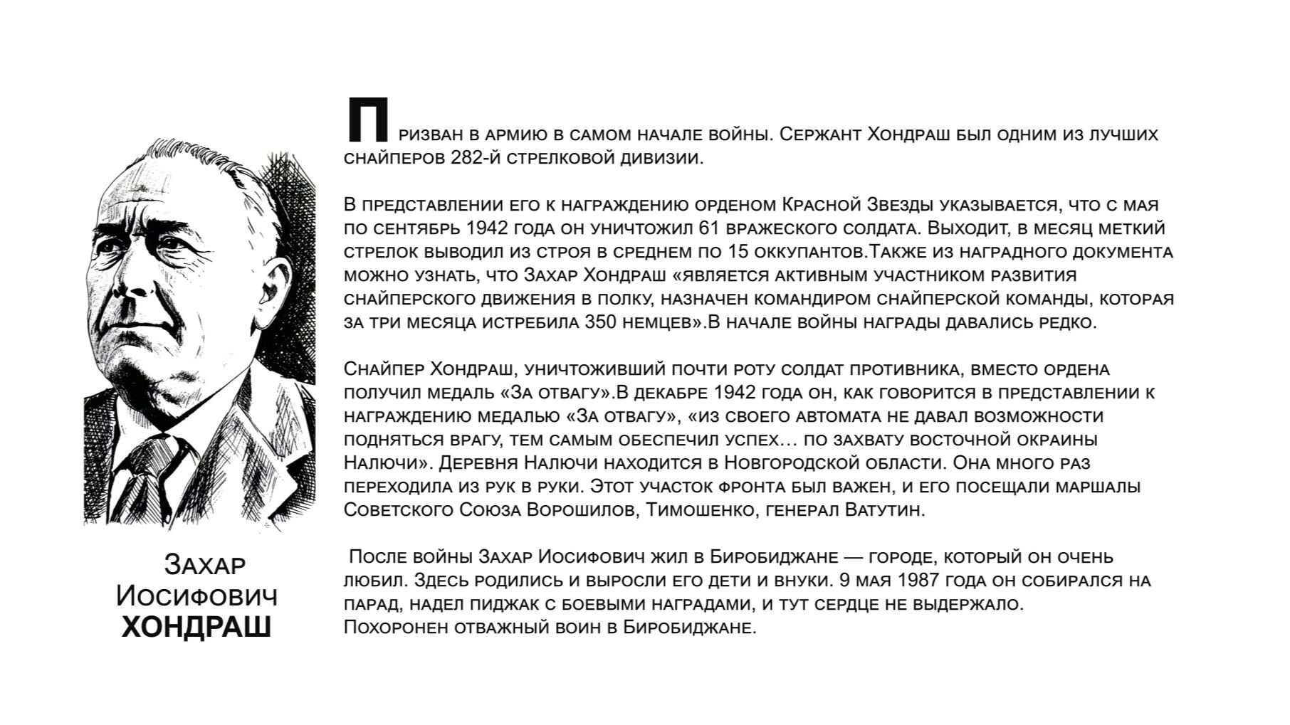 В годы Великой Отечественной войны на фронт ушли более 11 тысяч жителей ЕАО, семь тысяч наших земляков погибли или пропали без вести. Те, кто вернулись, прожили достойную жизнь. Они строили дома, выращивали хлеб, учили детей, стояли на охране правопорядка. Этим людям мы посвящаем нашу галерею "Бессмертный взвод". Среди героев - Захар Иосифович ХОНДРАШ