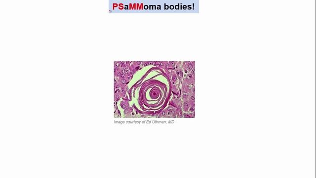 (2021) USMLE RX Pathology - Psammoma Bodies Псаммозные тельца (греч. psammos песок; син.: песчаные тельца, corpora arenacea) *Псаммома (Psammomd) - опухоль, содержащая мелкие, напоминающие по внешнему виду песок, частицы (псаммозные тельца (psammoma bodies)). Образование этой опухоли часто встречается при раке яичников, однако иногда она может развиваться и в мозговых оболочках (оболочках, окружающих головной мозг).