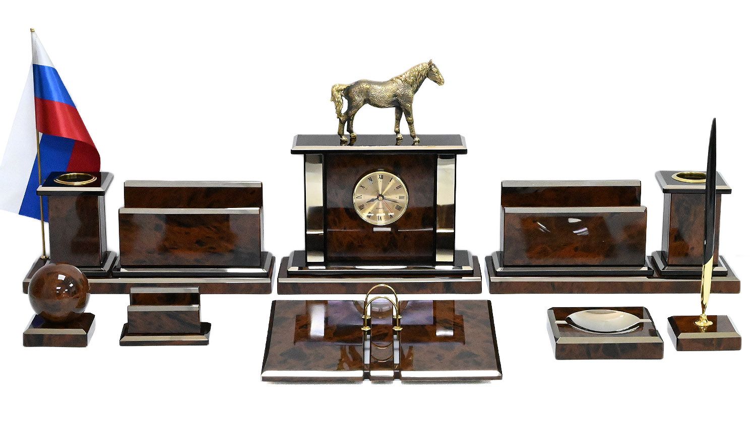 •Материал: обсидиан двух оттенков, кварцовый механизм, латунь. •Техника исполнения: камнерезные работы, нанесение нитрида титана с помощью УВН (установка вакуумного напыление) художественное литьё из бронзы. •Размеры: при плотной компоновке на столе 870*390*275мм. - Часы 222*80*255мм. - Основание под часы 250*100*20мм-1шт. - Календарница 250*200*30мм-1шт. - Органайзер 190*80*100мм-2шт. - Карандашница 81*81*115мм-2шт. - Основание под бумажницу и карандашницу 300*100*20мм-2шт. - Скрепочница 122*122*25мм-1шт. - Визитница 98*60*53мм-1шт. - Подставка по шар 73*73*20мм, шар 69мм. - Подставка с тюльпаном 73*73*20мм-1шт. •Упаковка: деревянный чемодан обтянутый кожзамом. Масса нетто: 14кг. Масса брутто: 21,5кг