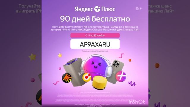 Подключайте Яндекс Плюс и выигрывайте призы! Активируйте промокод AP9AX4RU на 90 дней Яндекс Плюса и автоматически становитесь участником розыгрыша призов: iPhone 15 Pro Max, Яндекс Станции Макс или Яндекс Станции Лайт. А по ссылке https://plus.yandex.ru/getplus?target=299-1m-1r&utm_source=getblogger&utm_medium=paid_bloggers&utm_content=goal-PL&utm_campaign=MSCAMP-131&utm_term=AP9AX4RU Вам будет доступен период 30 дней за 1 руб даже для тех, у кого была подписка, но завершилась более месяца назад! Условия подписки: https://yandex.ru/legal/yandex_plus_conditions/. 30 дней подписки "Яндекс Плюс" за 1 руб., далее автопродление - 299 руб/мес. Требуется указание данных банковской карты. Только для пользователей, ранее имевших подписку Яндекс Плюс (или иную, ее включающую), которая более не является активной. Предложение до 31.12.23. Предложение может быть недоступно, если пользователь ранее неоднократно оформлял подписку по акционному предложению. Яндекс Плюс это: — 4 аккаунта в одной подписке (до 10 устройств) — Индивидуальный контент и рекомендации — Баллы Плюса, которые можно копить и тратить в сервисах Яндекса — В Яндекс Плюс входит: Яндекс Музыка, Кинопоиск, Яндекс Go, Яндекс Афиша, Яндекс Маркет, Яндекс Еда, Яндекс Драйв, Заправки.