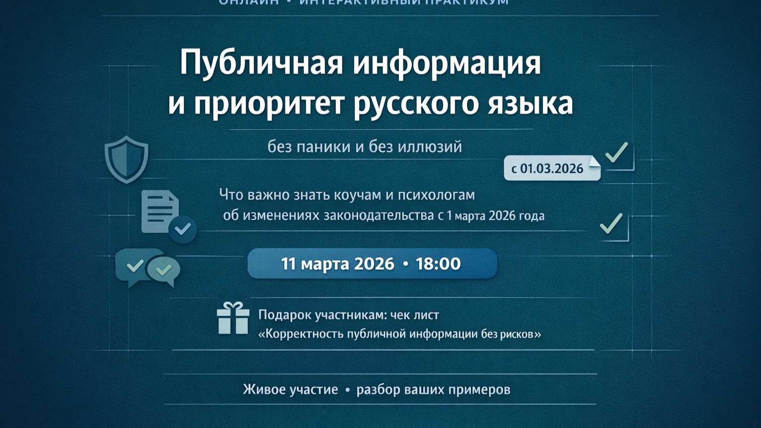 С 1 марта 2026 года вступают в силу изменения, которые затрагивают тех, кто работает с конечным потребителем (B2C): коучей, психологов, экспертов, онлайн-школы, студии и сервисы, продающие услуги и продукты гражданам. В публичном поле вокруг этого много тревоги и категоричных формулировок. Я предлагаю подойти к теме трезво: без паники, без «срочно всё сносить», но и без иллюзий, что «это никого не касается». ⚠️Почему важно отнестись серьёзно: риски - не только штрафы, но и предписания, остановка/перезапуск рекламных кампаний, жалобы, споры с клиентами, претензии платёжных провайдеров. При этом «правильная стратегия» - не нервные движения, а спокойный аудит. О чём встреча: Мы разложили по полочкам два участка, где чаще всего возникают риски: 1 Публичная информация и приоритет русского языка: сайт, лендинги, соцсети, реклама, афиши, кнопки, меню, тарифы, карточки на маркетплейсах, вывески, публичные документы, которые видит клиент. 2 Подписки и периодические платежи (если у вас есть клуб/доступ по подписке): как описывать условия и выстраивать сценарий отмены так, чтобы не провоцировать претензии и спорные списания. Что вы получите за 90–120 минут • Чёткое понимание, кого это касается (B2C/B2B/смешанная модель) и где границы требований. • «Красные флаги» — самые частые ошибки в публичных текстах (и как исправить без потери смысла и стиля). • Пошаговый аудит клиентского пути: анонс/реклама → лендинг → оплата → доступ → продление/отмена (если есть подписка). • Набор готовых решений: русские названия тарифов, замены англицизмов, примеры корректного оформления терминов и названий. • План действий на 7 дней: что сделать в первую очередь, чтобы не совершать лишних телодвижений, но убрать основные риски. Встречу проводит Марина Котлярова, супервизор, Мастер коуч, MCC ICU ICTA, основатель и руководитель Центра системного коучинга, Executive&Business Coach ICU ICTA, бизнес-тренер, кризисный психолог, автор научных статей и техник по системному коучингу, методолог и преподаватель образовательных программ профессиональной переподготовки, юрист. 🎁Подарок участникам «Чек-лист для коучей и психологов: корректность публичной информации без рисков» — удобный инструмент для быстрой самостоятельной проверки сайта, соцсетей, рекламы, анонсов и клиентских документов. Программа повышение квалификации с выдачей Удостоверения о повышении квалификации государственного образца https://sccentre.ru/courses/poziczionirovanie-i-professionalnaya-identichnost-formirovanie-autentichnogo-brenda-eksperta Программа профессиональной переподготовки в Дипломом государственного образца с правом ведения деятельности в области управления персоналом https://sccentre.ru/courses/profession-career-coach Подписаться на ТГ канал https://t.me/sccentre_ru Запись на индивидуальные сессии http://marina-career.com