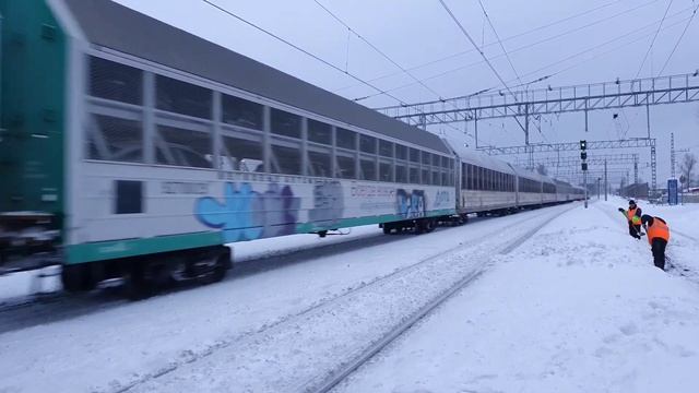 Неспешный грузовой, быстрая Ласточка, ЭП2Д по 4 главному и ожидающий ВЛ10у | Щербинка | снегоборьба