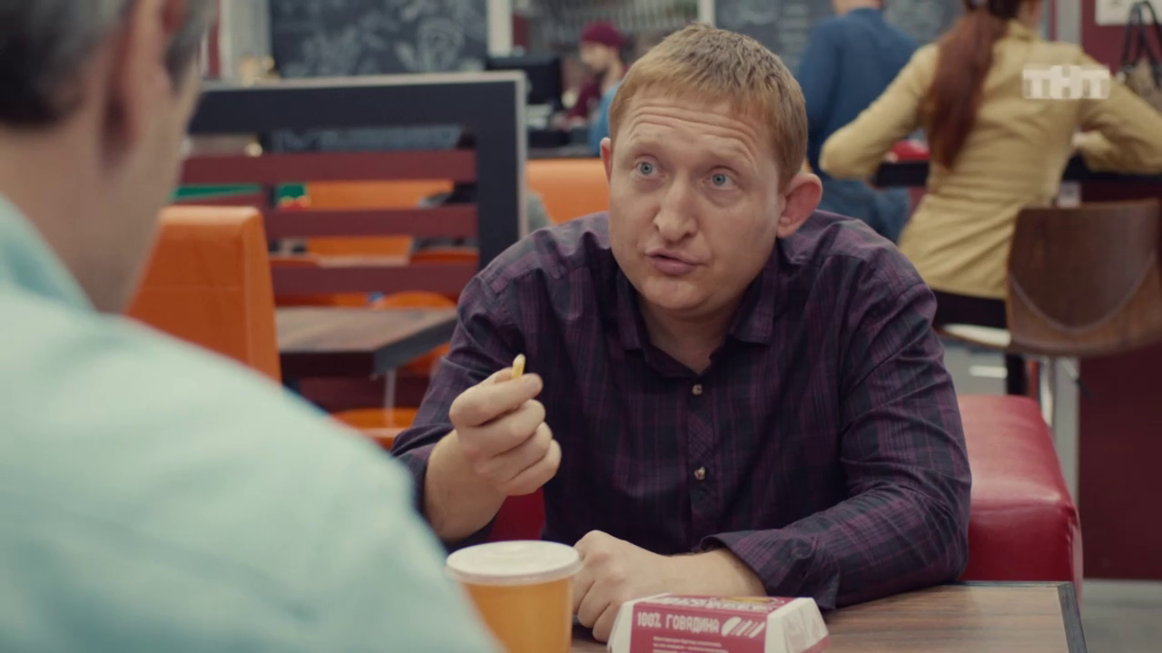 Андрей и Вадик обсуждают за завтраком в фуд-корте все минусы и плюсы США. Вадик вообще уверен, что американцы всё решают через суд, а русские люди привыкли разбираться кулаками.